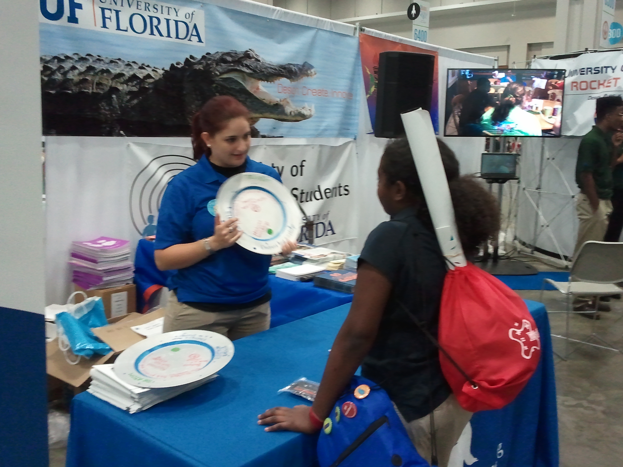 MSE Student Bryeon Jones works with students to make “lava lamps” as part of the NSBE team at the USA Science and Engineering Festival.