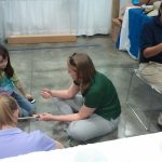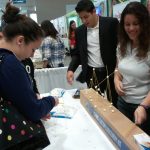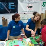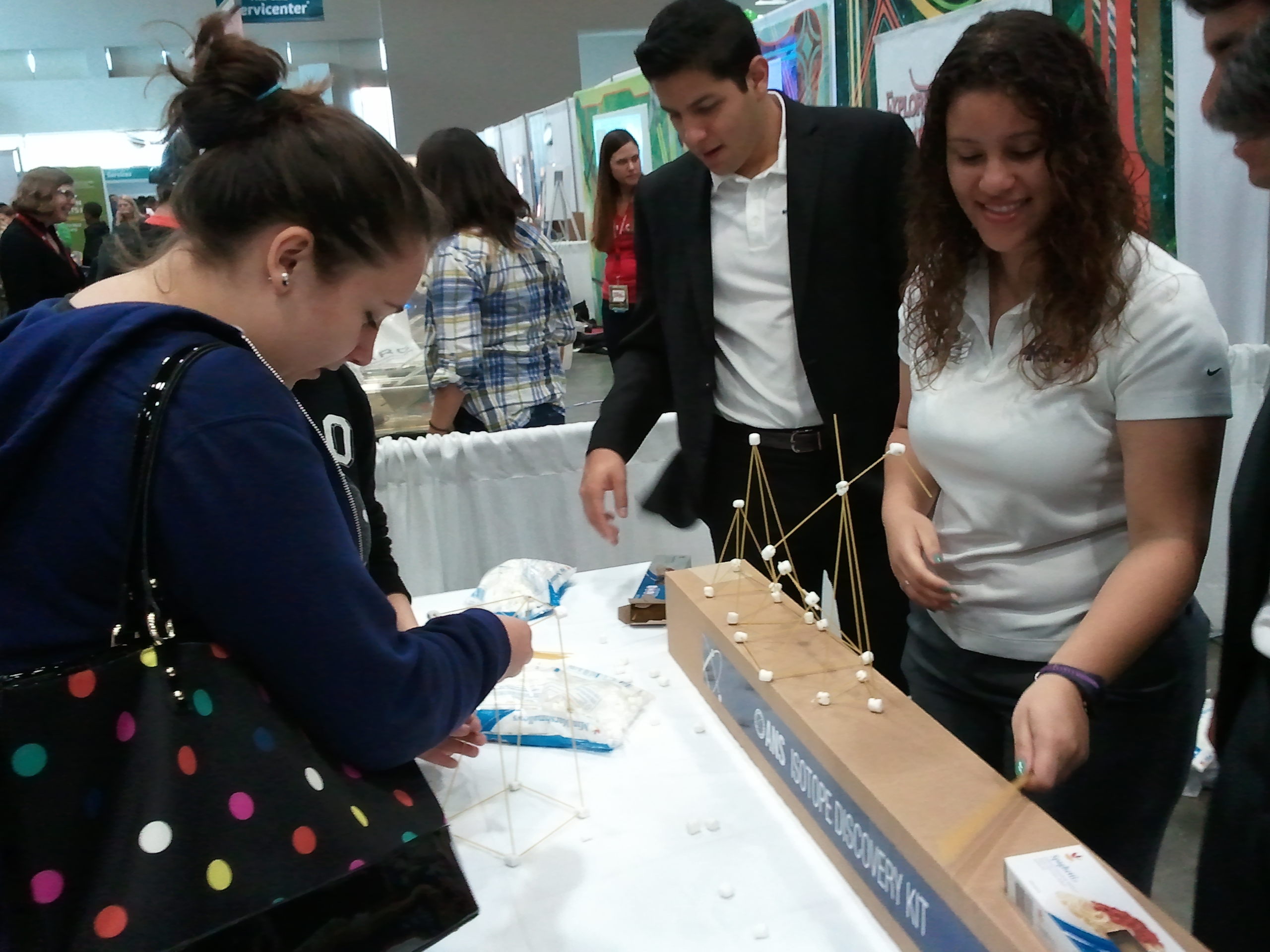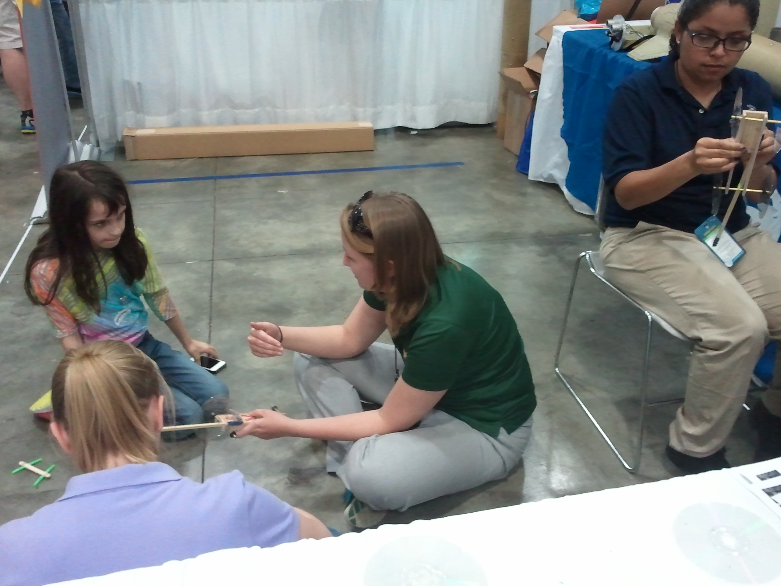 MSE Student Jessica Poulsen works with students to build a mouse trap car at the USA Science and Engineering Festival.