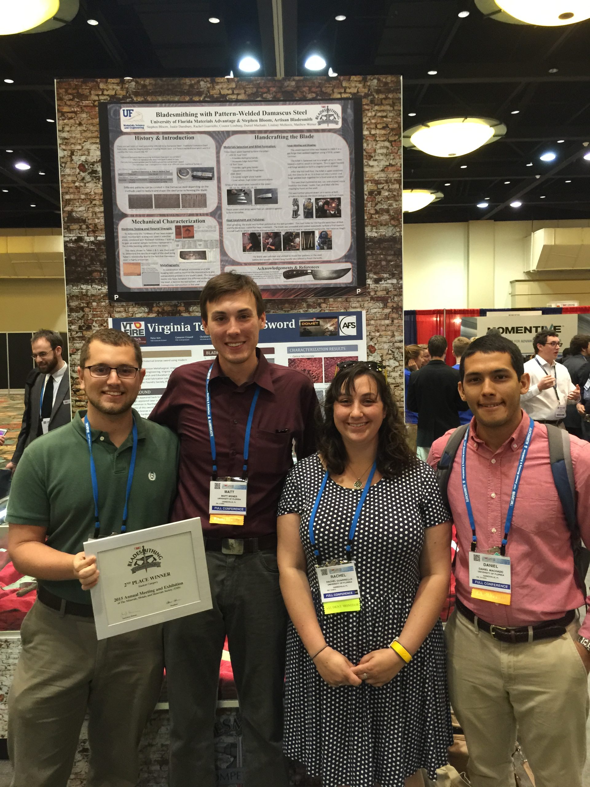 The UF Bladesmithing Team took second place at the March 2015 TMS Meeting in Orlando, Florida. The first-ever competition consisted of 19 student teams from throughout the world to produce a knife or sword blade using traditional blacksmithing techniques. The members of the team were Justin Dansbury, Mathew Wener, Daniel Machado, Dean Sage, and Rachel Guarriello.